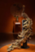 「翠羽芳華」堪稱熔銅由平面邁向立體的典範之作。朱大師以巧思將平面澆注的熔銅片再度淬煉,彎折出孔雀尾羽的優雅弧度,使一尊雍容而靈動的孔雀華麗現身。「山水銅印」系列以熔銅自然生成的孔洞紋理,勾勒山水的蒼勁氣韻;與縮龍成寸的印章精神相呼應,一方方山水銅印,亦如一座座微縮山水,氣象萬千。 「雨歸漁歌」 結合了熔銅與高溫琺瑯彩,色彩絢麗。其天然的紋理引發觀眾無限想像,有人視其為海底珊瑚,有人於局部辨出人像,意趣盎然。